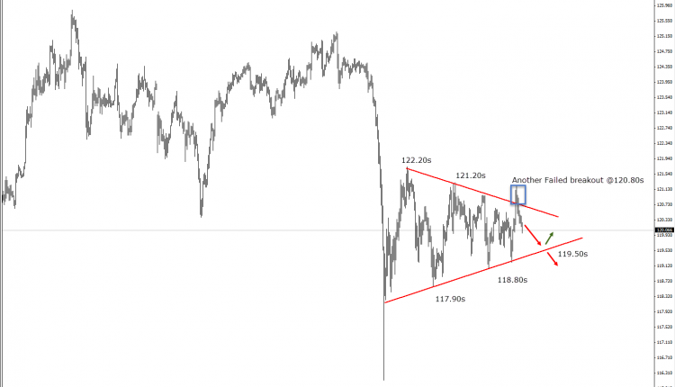 The price fail to broke symmetrical Triangle. however, we will see again the market is trading in the range between 118-121, waiting for successful breakout .