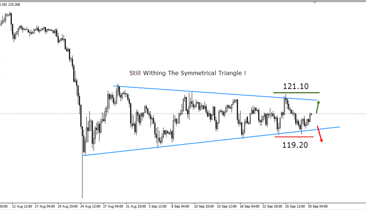 Nothing to be said in the range market, technically, we are awaiting a successful breakout for the shown symmetrical triangle. So, 121 & 119.20 we will consider it the upper band and lower band for the that range behaviour, respectively.