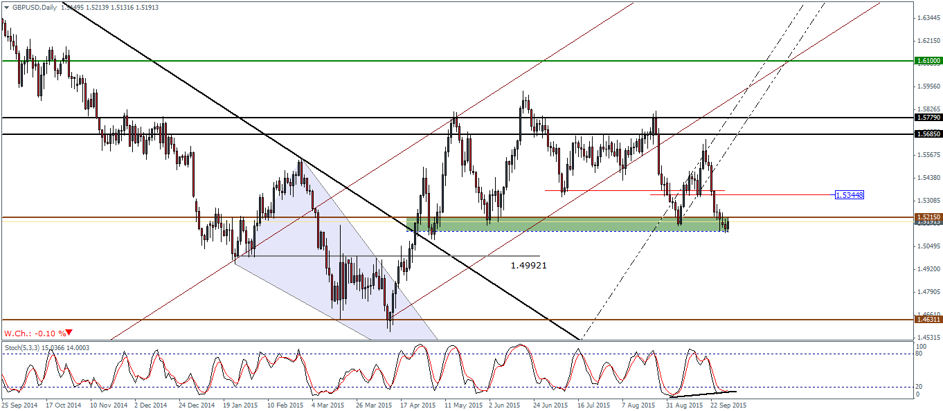 GBPUSD (1.518): GBPUSD has posted sharp declines on breakout of the rising price channel on 26th August. The declines saw prices quickly testing support near 1.5215 – 1.5133 which offered a strong bounce sending prices to retest the breakout level. The minor rising price channel plotted off the lows at 1.5178 from 4th September through the highs of 1.559 on 17th September was also broken near the identified support at 1.536 and 1.5344. We expect to see another small rally in GBPUSD identified by the bullish divergence with the Stochastics which could see prices retest the broken support at 1.536/1.5344 to establish resistance. The support zone at 1.5215/1.5133 is likely to come under pressure if prices fail to break above the identified resistance. To the upside, if prices close above 1.536/1.5344, the next level will be close to the main resistance of 1.5779 – 1.5685, while to the downside, a break of the support below 1.5133 will see a sharp decline to 1.50