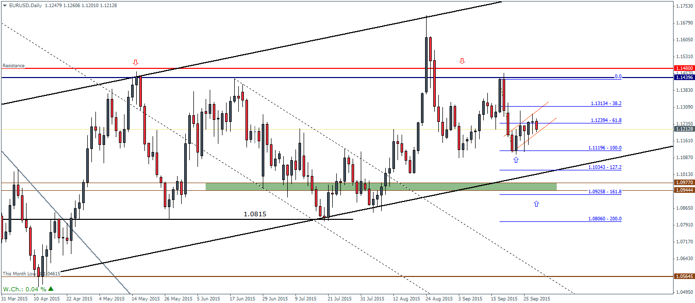 EURUSD (1.120): EURUSD formed a doji candlestick pattern yesterday indicating the previous session’s bullish engulfing candle was probably losing strength and momentum. Today’s bearish close is likely to confirm the bears coming back into control. EURUSD has also formed a bearish flag pattern which will be confirmed on a breakout from the channel and on the break of the first support at 1.1119. The measured move to the downside on a successful flag pattern indicates a decline to 1.0925 at the minimum which sits just a few pips below the main support level identified between 1.0977 – 1.09444. Price is still trending in the larger rising price channel indicating that the longer term bias is to the upside, but it could change depending on how prices react near 1.0925 region. To the upside, resistance comes at 1.144 region if a daily candle manages to close above the doji high at 1.128.