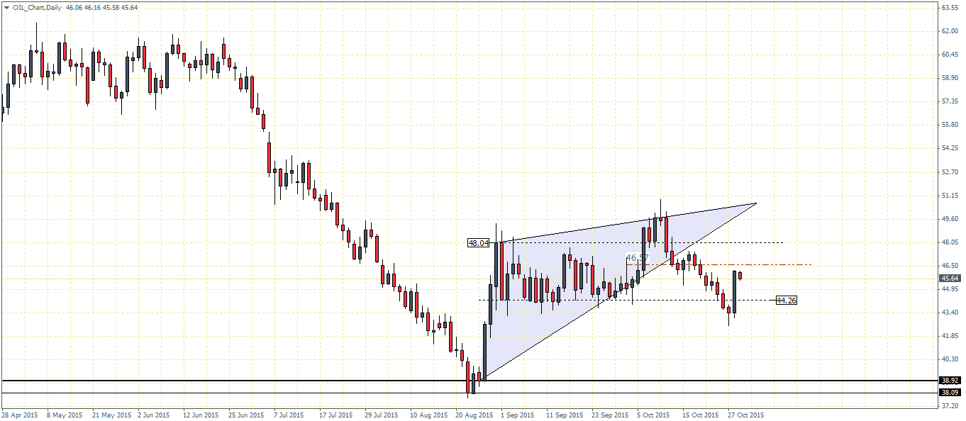 The price action in WTI Crude oil is likely to see prices stay range bound and any hopes of a rally could likely happen after a potential test back to the previous lows. In terms of economic fundamentals, the US GDP report is due out today. A weak print is likely to point to the fact that the global crude oil demand remains subdued while on the other hand, production remains elevated. The US Dollar’s appreciation yesterday is another factor to consider in light of renewed bets on a December rate hike which could keep the Greenback well supported and in turn put downward pressure on Crude Oil prices.
