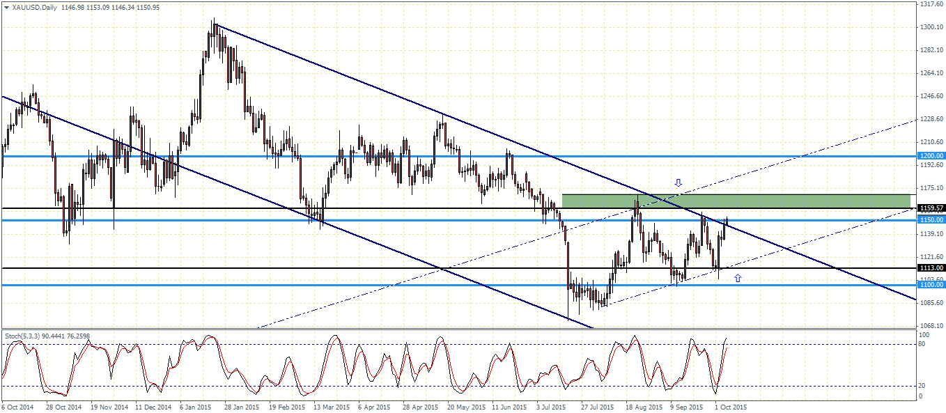 On the daily charts, the price action is a bit more clear as we notice the price levels of 1170.26 and 1160 most likely to offer a short term resistance. The Stochastics oscillator hasn’t yet signaled any divergence while price managed to break out of the larger falling price channel. It will be interesting to see how Gold reacts to the resistance level within the minor rising price channel. Failure to clear 1160 could potentially see Gold decline back into the main descending price channel with the next support coming in at 1113 region.