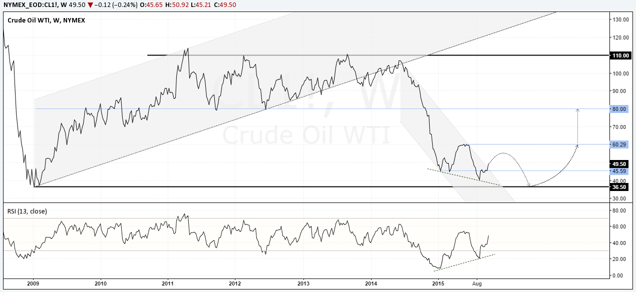 Currently, prices have been bouncing off near the lows of $36.5 which was last seen around late 2009. Applying the 13 week relative strength index, we notice a short term bullish divergence that was formed where the 13 period RSI failed to confirm the new lows in prices. We expect to see the current rally in fact turn out into a short term bounce with prices breaking out from the steep falling price channel. To the upside, the short term resistance at $60 is likely to be a strong level, if Crude Oil manages to rally to this level.