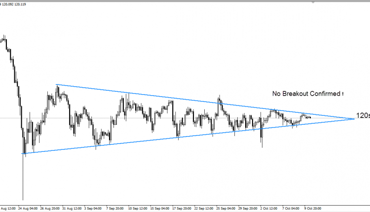 Nothing to be said in the range market, technically, we are awaiting a successful breakout for the shown symmetrical triangle. So, 121 & 119.20 we will consider it the upper band and lower band for the that range behavior, respectively.
