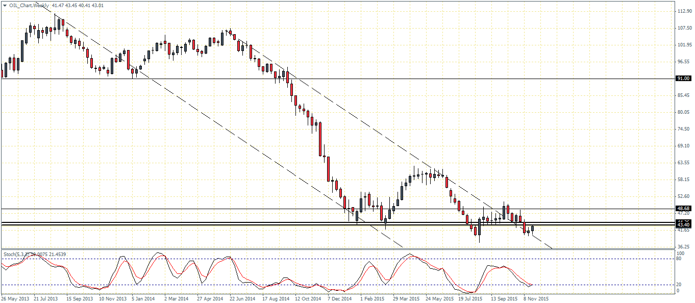 On the daily charts, Crude oil still remains bearish considering the lower highs and lower lows being formed on the charts. The current retracement is likely to stall near the previous lows at $43.40 through $44.26. If this level of previous support is established as resistance, Crude Oil is likely to decline further on a break below the recent lows at $40.66.