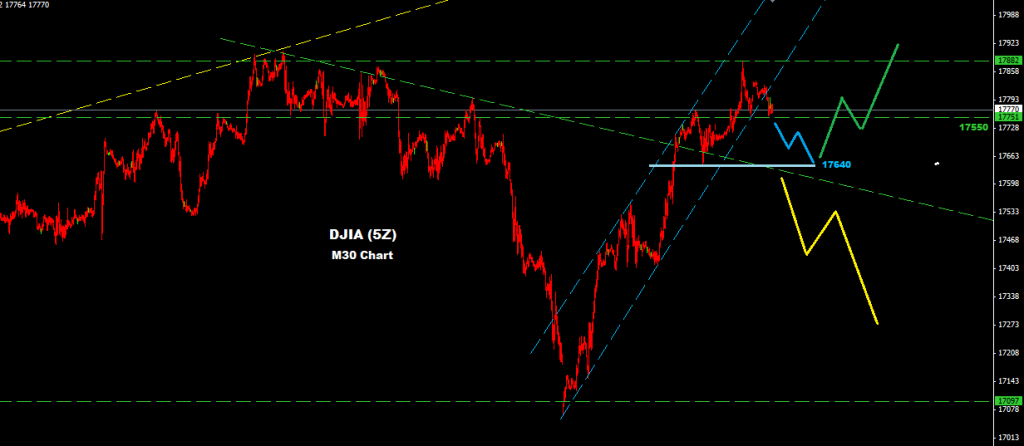 as long as market holding trades above 17640 will expect farther advance above 17900 zone, while below 17640 market may build another drop correction which may target 17250 zone
