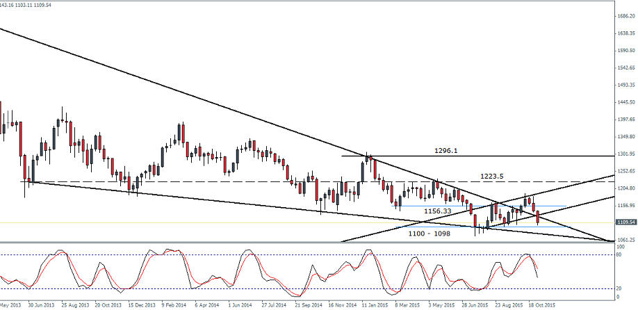 On the 4-hour chart time frame, prices declined to find support near the 1112/1115 through 1105/1100 region of major support. Price needs to rally above this zone in order to keep any bias for a move to the upside alive. Resistance at 1132/1140 will be the next level of interest to the upside. The Stochastics oscillator has been trending strongly in the oversold level but we expect to see another low being made in prices. If the Stochastics points to a divergence by printing a higher low here, a correction to 1148/1150 could be inevitable. To the downside, if prices decline off the current support zone, then a break below 1100 could see a potential longer term decline to retest previous lows at 1000.