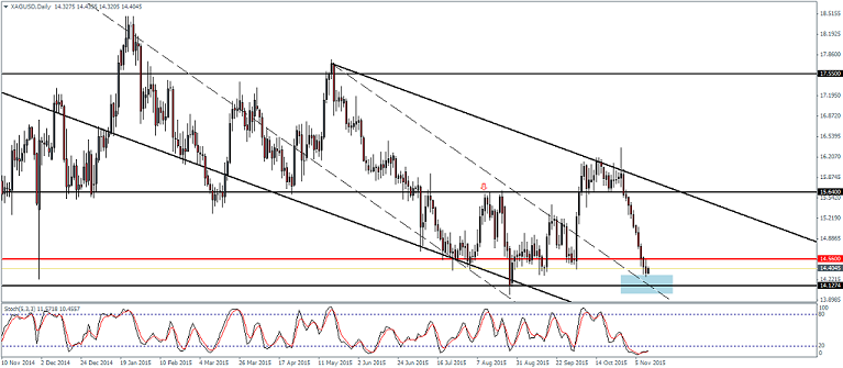 For Silver, price action has dipped to a weekly low of 14.27 before easing back. The dynamic support formed by the descending wedge on the weekly charts is likely to see prices hold out for the short term. The descending triangle pattern has been re-adjusted to capture the recent highs near 16.05, made earlier in October. If the dynamic support off the descending wedge holds, a short term bounce could see Silver rally back to the broken support at 15.64 through 15.45 region to establish resistance and only a break higher will mark a bullish sentiment in prices.