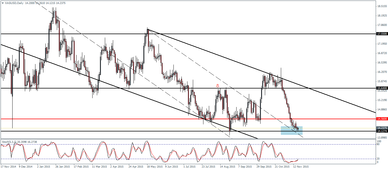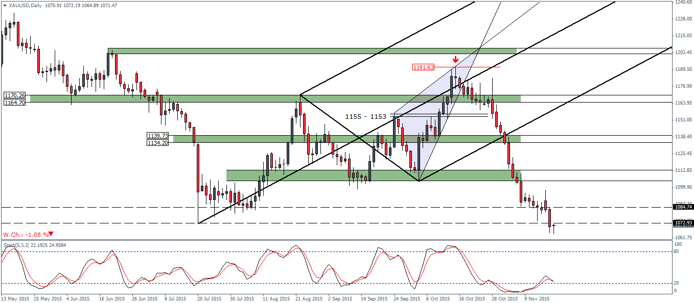 The downtrend in the metals market has seen a sharp slump in prices across the board. Gold prices have declined sharply by -9.06% since the interim top formed on the 19th of October at 1177.94. At the time of writing, Gold is trading near a 5 and half year low of 1071.23. With Silver, prices have declined by a massive -11.05%, trading near a 6 year low of 14.23. The declines in the metals markets was sudden as the Fed surprised the markets at the October FOMC meeting noting that the decision to hike rates would be taken in December. With an improved unemployment rate dropping to 5.0% combined with stable inflation prices, the markets are pricing in a 25bps rate hike from the Federal Reserve this December.