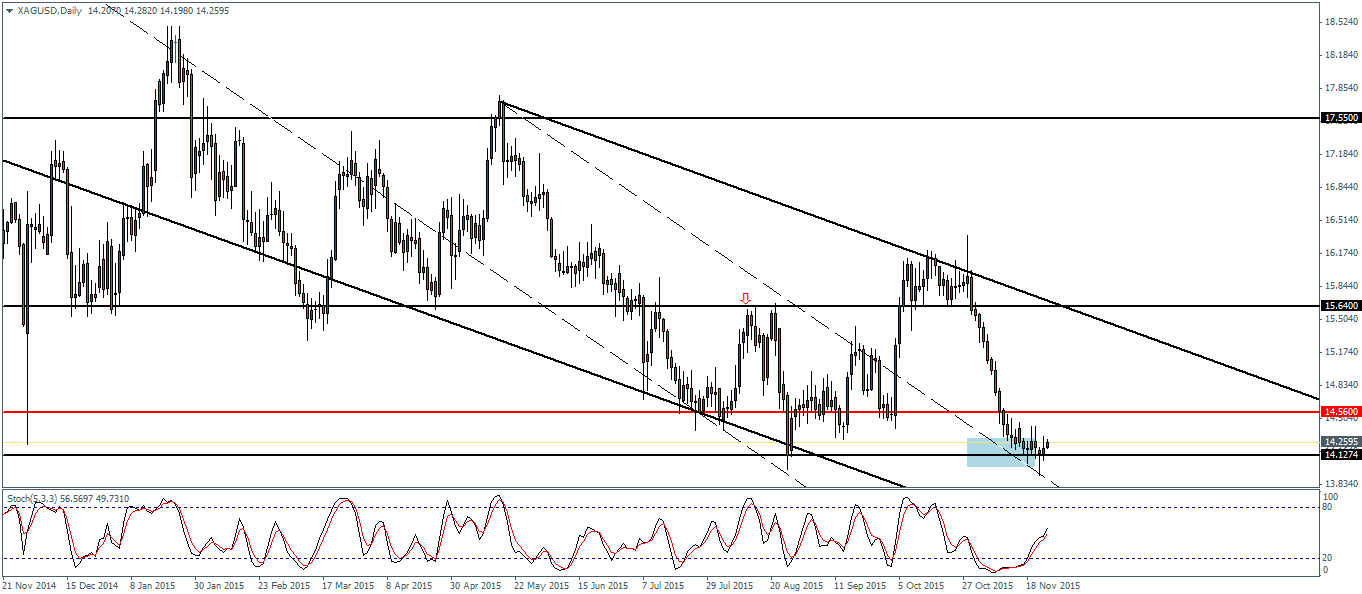 On the daily chart, Silver prices remain range bound above 14.12 region, an area that was previously identified as the most likely support level to hold prices. The daily chart shows the potential double bottom being formed at this level, but for the double bottom to be validated, a breakout above 15.64 would be required.