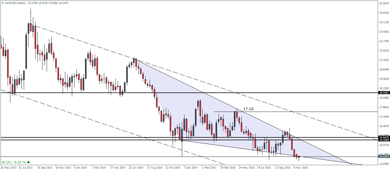 Silver prices are also well supported by the trend line within the larger descending triangle pattern. The current weekly candlestick could potentially signal a change of trend if we see a bullish close this week. The upside bias would be even more strengthened if we see a bullish close above last week’s open at 14.39. In Silver, the most likely rally will see a test back to 15.45 level of support/resistance.