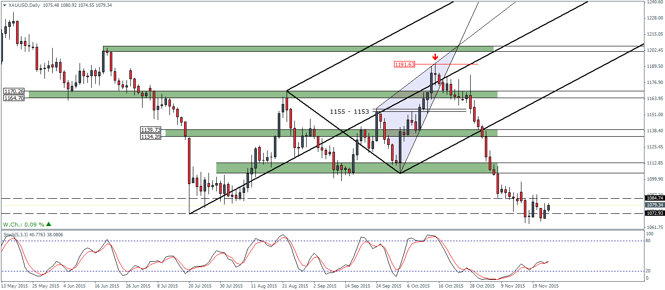 The precious metals markets are attempting to recover after nearly a few straight weeks of declines. Gold prices touched a weekly low at 1066.5, while Silver dropped to 13.89, both posting nearly a 5 year low across the board. Yesterday, Gold and Silver managed to post a strong rally, recovering off the lows and in the process rising for two consecutive days. With the markets starting to price in the Fed rate hike in December, the declines in the precious metals markets also reflect the same.