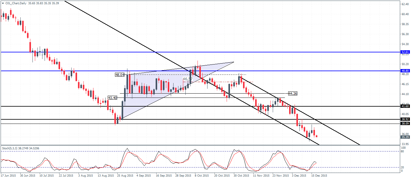 Last week alone, WTI Crude Oil fell by -12.12% while this week prices reached a high of $37.85 a barrel before giving back the gains. With the US Federal Reserve hiking interest rates and signaling the start of a tightening cycle, the US Dollar continues to remain well supported for the moment and the stronger Dollar will continue to put pressure on Oil prices in the near term.