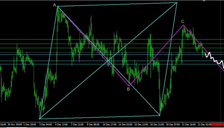 The above shown geometric pattern signals a probable downward trend continuation move from C to D toward its target from below the 1067.09 to as low as the D point at the 1051.65 area.