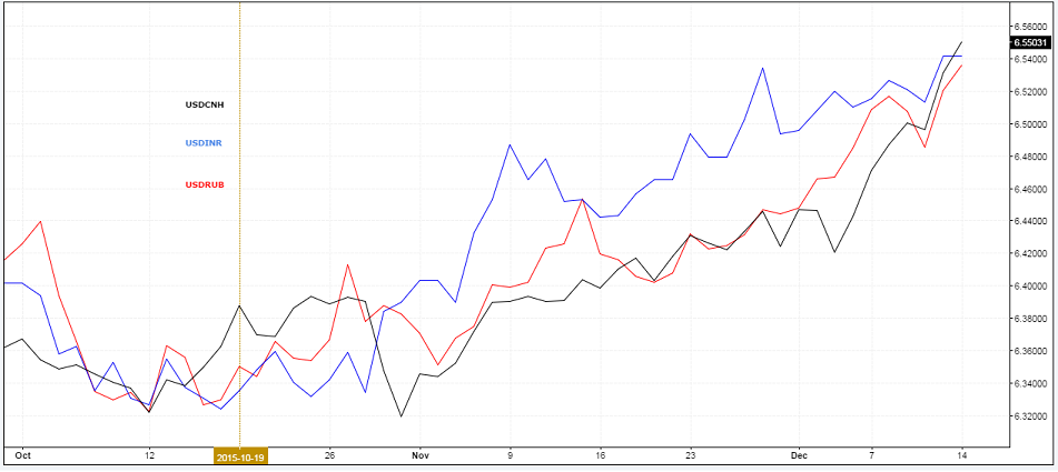 The emerging markets have been particularly hit since October’s Fed statement which put the December rate hikes on the table. For example, the Dollar has strengthened by nearly 14.64% against the Ruble, while rising 3.46% against the Indian Rupee and 3.63% against the Chinese Yuan.