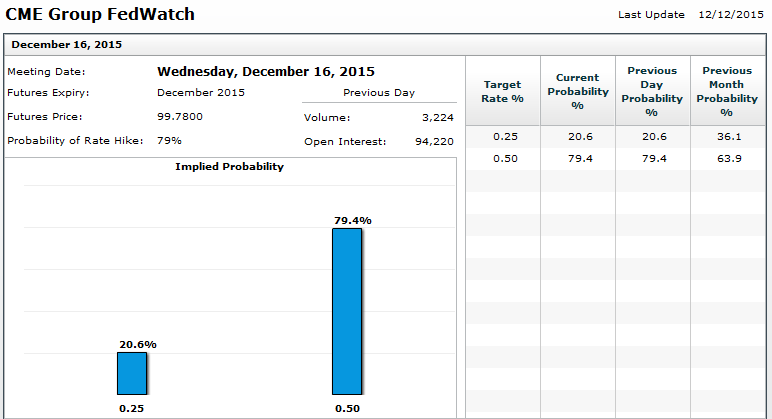 The Fed funds futures rates, according to the CME Group is pricing in a 79.4% probability for the interest rates to be hiked by 25bps.