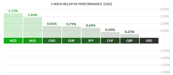 The markets had a holiday shortened week last week but the week was marked with key important data from the US, UK and Japan. Closing out the week, the NZD was the top performing currency, which gained 1.72% against the US Dollar followed by the Australian dollar which closed the week with 1.44% gains and the Canadian dollar which gained 0.81%. The commodity risk currencies were clearly the top gainers last week against a weaker Greenback.