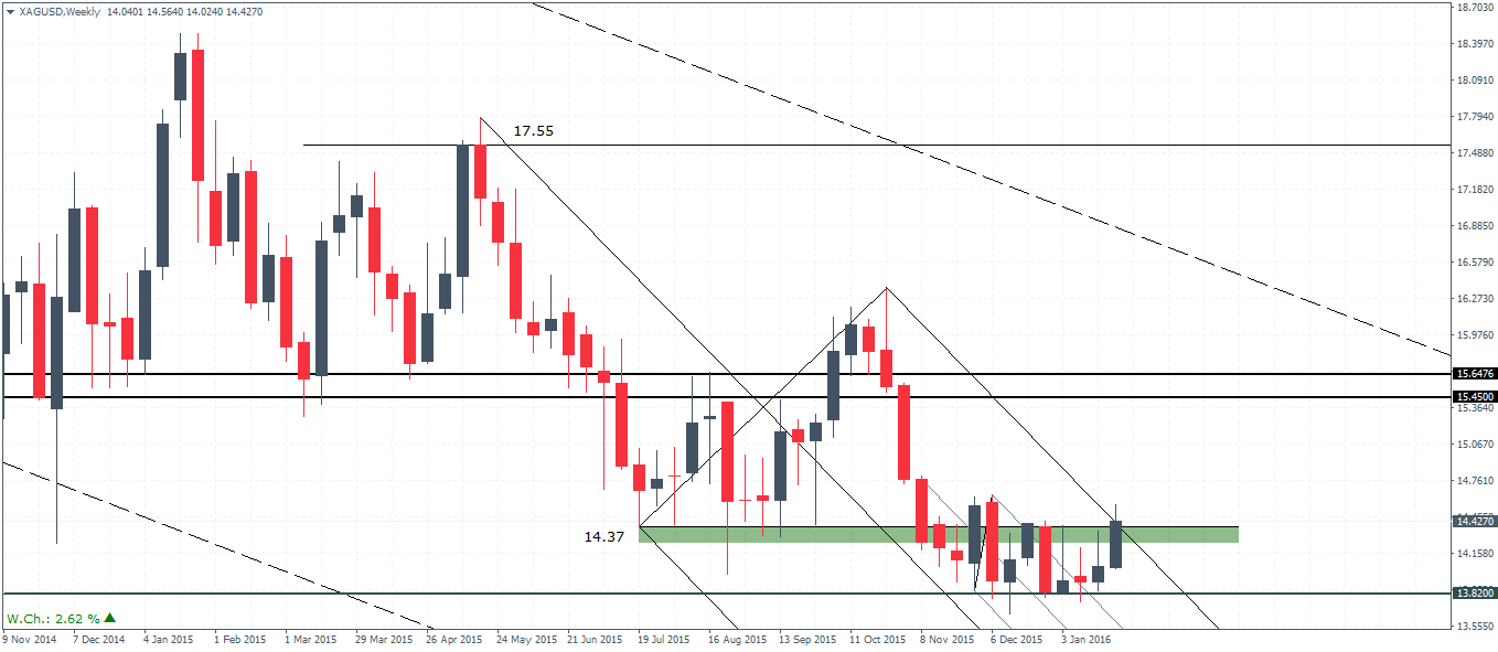 Starting with the Weekly chart for Gold, we notice that prices have managed to break out from the falling median line (red). The upside target is likely to see Gold test the 1156 – 1134 resistance level and prices could initially tip back lower to the 1100 – 1098 region to establish support ahead of a further rally. There is evidence of a basing pattern formed near the 1100 – 1098 price zone which is likely to hold prices and form the bias to the upside. With a monthly close above 1088 now coming in as a likely event, it would mark a strong bullish close above December 2015’s doji high signaling a further move higher.