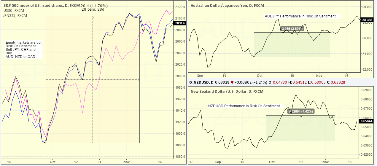 2. If you notice the markets being sold off strongly, most importantly, the Nikkei225 and the US S&P500 and the Dow Jones Index chances are that a Risk-Off sentiment is prevailing and, therefore, Yen, CHF are likely to outperform AUD, NZD and CAD. Alternatively, if the US and Asian equities closed with strong gains, the market is in a Risk-On sentiment then the AUD, NZD and CAD will outperform the safe haven currencies, Yen and the CHF.