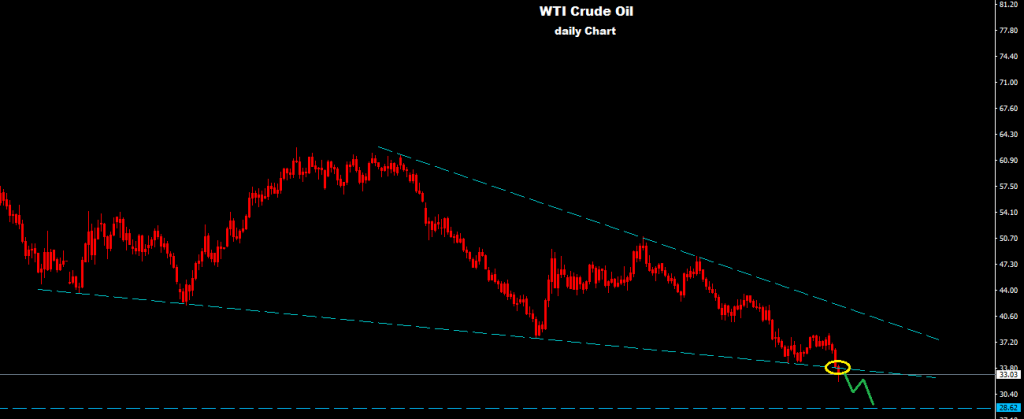 As we see over the chart market managed to fell below support line of the falling wedge where managed to hit below support 33.60