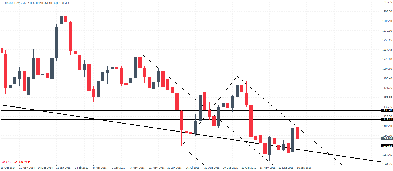 Silver prices have seen a rejection near $14.37 support to establish resistance. The current weekly price action is posting a bearish engulfing on the body of last week’s price action but is stalling near 13.82 minor support. A break below 13.82 could signal further declines lower with Silver likely to post new lows. On the other hand, if prices stall at this support, Silver prices could expect to see some kind of bounce to the upside, provided the previously established resistance at 14.37 is broken.