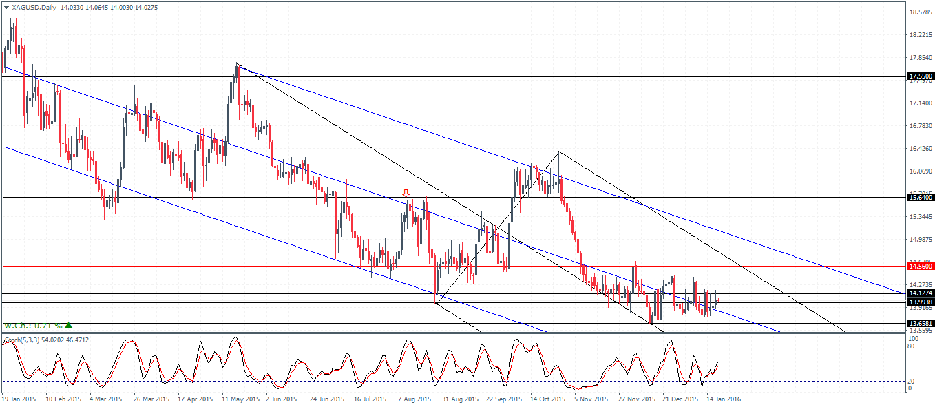 The weekly chart for Gold gives a long term view where prices are consolidating inside the falling wedge pattern with 1131.86 being a key level. A break above this price level could mark the start of a potential short-term rally in the markets which could see an eventual move towards 1223 – 1200 region in the medium to long term basis which would mark a retest of this broken support level for resistance. The monthly chart will offer clues as this month’s price action needs to close on a bullish note after December 2015’s Doji candlestick pattern. So far price is trading above 1088 level but a monthly close above 1088 could signal the move to the upside.