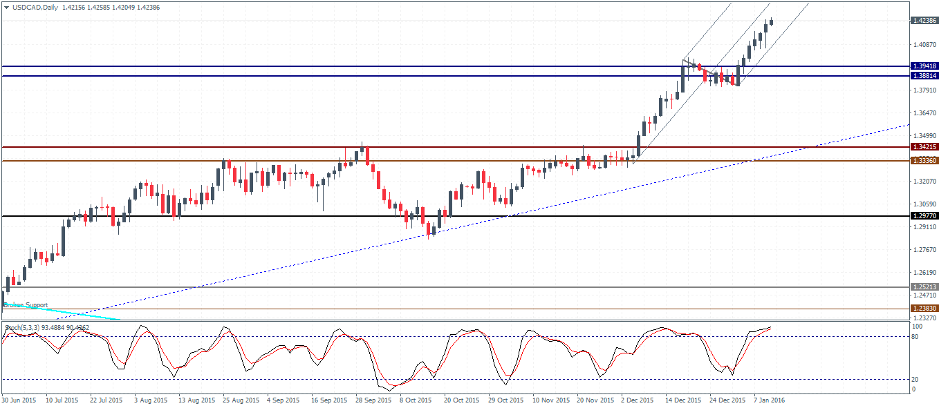 USDCAD (1.423): There seems to be no respite for USDCAD as the Canadian dollar remains very weak against the Greenback. The minor consolidation near 1.388 saw prices rally with a renewed bullish momentum. Plotting the Andrews’ pitchfork, a potential failure in the median line could, however, signal a move lower with a firm test of support needed to be established at 1.388 – 1.394 region. A test of support here could signal a continued move to the upside with the potential to post new highs. Alternatively, if the support gives way, 1.342 – 1.333 support will come into question.