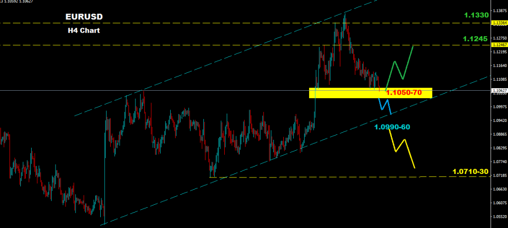 تحت اسعار 1.1050 فان السوق قد يتجه لمنطقة تداول محتمله بين مستويات 90-1.0960 و 80-1.1070