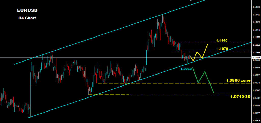 كما نرى على الرسم البياني السابق لدينا فان السوق نجح بالحفاظ على مستويات الدعم للقنال السعريه الصاعده عند اول اختبار لمستويات 1.0960, فيما لا يزال السوق يحافظ على منطقة التداول قصيرة الاجل ضمن مستويات 1.0960-1.1070 كما اشرنا لها سابقا
