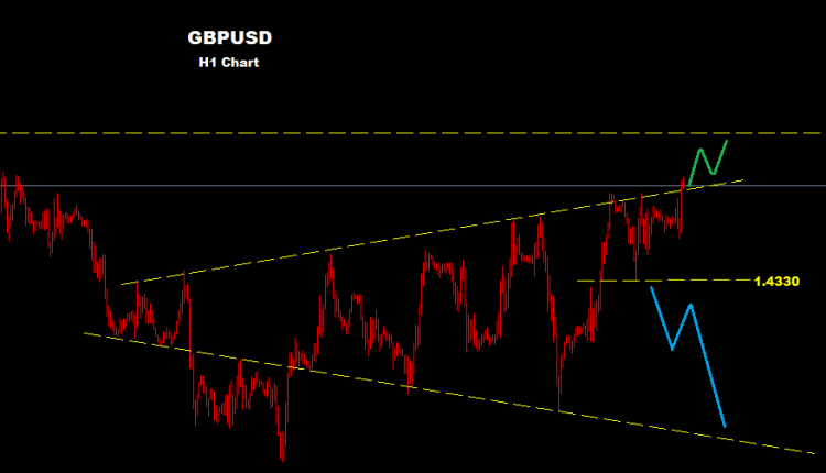 كما نرى على الرسم البياني فان السوق نجح بالحفاظ على تقدمه مع الحفاظ على تداولاته فوق مستويات الدعم 1.4330 فيما يحاول اختراق مستويات المقاومه لنموذج المثلث الان بالسوق