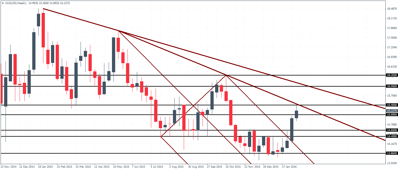 The precious metal’s rally over the past six weeks has seen one of the sharp gains that weren’t typical of an asset which has been repeatedly hammered by the bears. The pop in Gold prices this week saw prices testing the $1200 psychological barrier, and one which was achieved rather quickly. From our previous analysis, we set an initial target to 1154, based on the Cup and Handle pattern, but the gains made 1154 a rather conservative level in hindsight with absolutely no pullbacks either. This strong momentum led gains could, however, pose a risk of a strong reversal on the lack of any support levels being formed. It was not only Gold but Silver as well which surged strongly, testing the 15.4 resistance level in just under two weeks, after forming a base near 13.86.