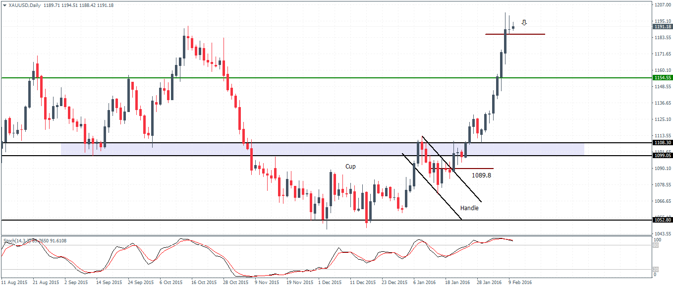On the daily chart for Gold, we notice a strong hidden bearish divergence being formed with the support level of 1089 – 1078 marking a retest of this broken resistance level to establish support. If indeed prices move lower, we could expect to see this pullback coinciding with the weekly chart’s potential right shoulder level. However, in order for 1089 – 1078 levels to be tested for support, Gold will need to break down the cup and handle’s neckline level of 1108 – 1099. As of yesterday’s close, Gold prices closed with a doji candlestick pattern indicating indecision. The doji pattern just below the 1200 resistance after strong rally points to a potential decline or correction in the near term.