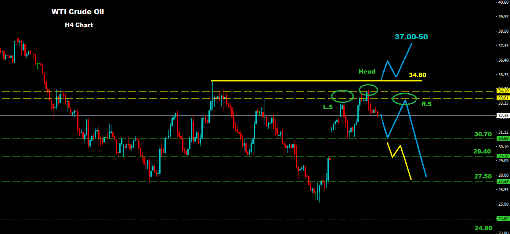 this Head & Shoulder model will sustain as long as market holding trades below 34.20 where market will face 31.80 and 30.70 as support level before continue drop toward 29.40 and 27.50