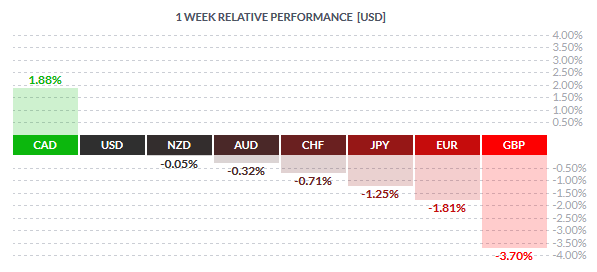The Canadian Dollar ended the week on a high note as volatility in Crude Oil prices lifted the CAD across the board. The US Dollar was the second top performing currency last week while the British Pound lost over 3.70% during the week followed by the Euro which is down -1.81% and into its second week of declines.