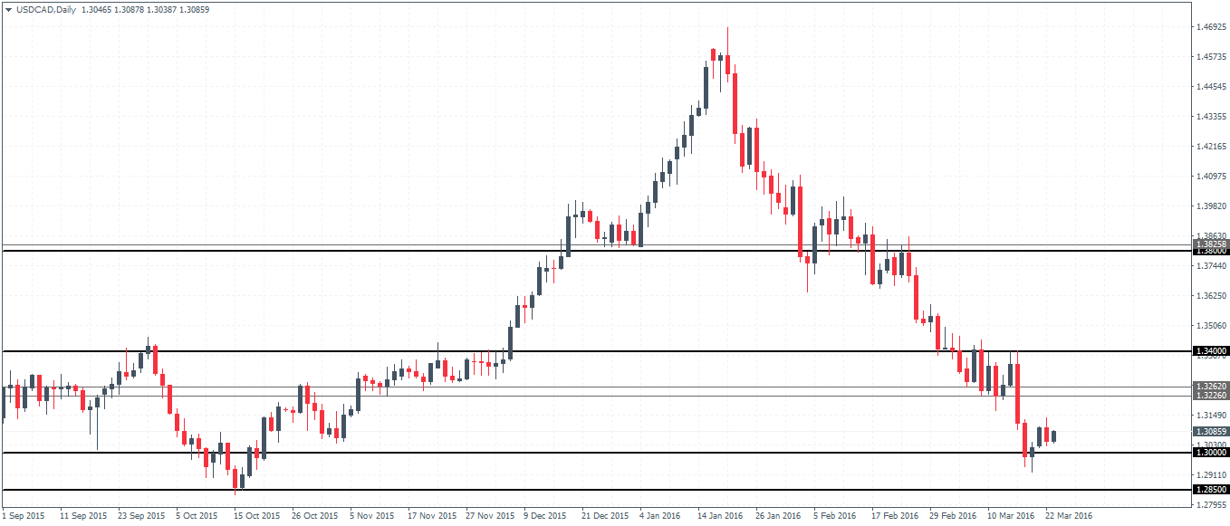 USDCAD is currently trading at 1.308, following a brief test to 1.30 on 17th and 18th of March. To the upside, resistance comes in at 1.3262 – 1.3226 above which sits the major resistance level at 1.34. To the downside, below 1.30, the next main support level is at 1.285.
