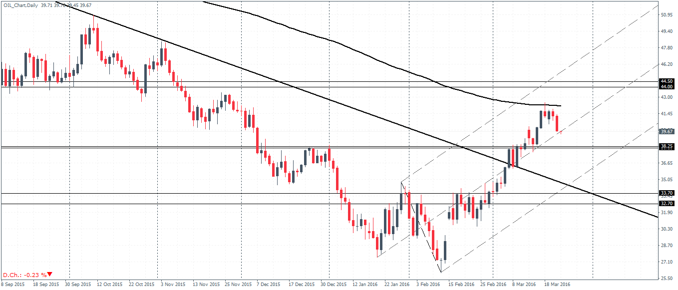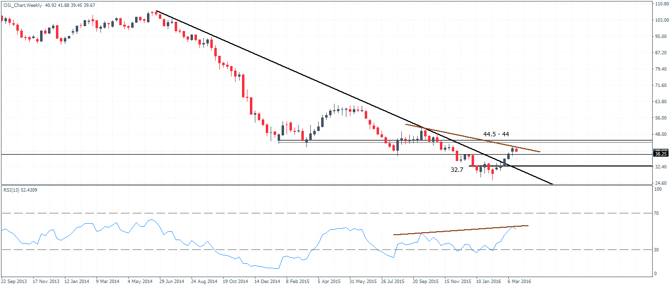 On the daily chart, prices look to have hit resistance from the 200 day moving average last Friday where the gains were capped at $42.23 from the 200 MA. The current declines will likely find short-term support near $38.25 – $38.10, which could see prices attempt to bounce higher. A close below this level on the daily time frame will be indicative of WTI Crude Oil declining lower to the weekly target at $32.7 region.