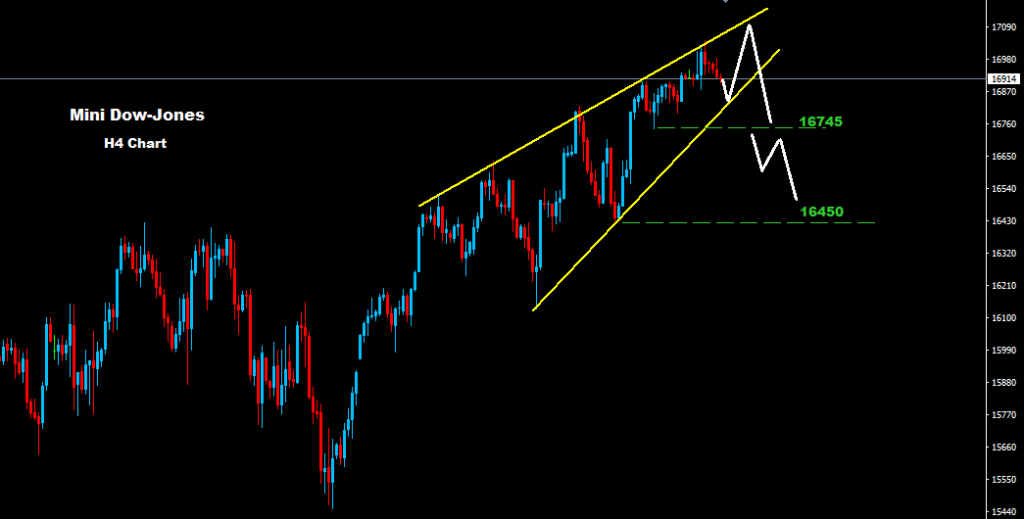 كما نرىعلى الرسم البياني فان مؤشرات المدى القصير تظهر قابلية السوق لبناء ما يسمى بنموذج الوتد الصاعد والذي اذا نجح بالتحكم بحركة السوق فان هذا سيدفع بحركه تصحيحيه هابطه على المدى القصير نحو مناطق 500-16400