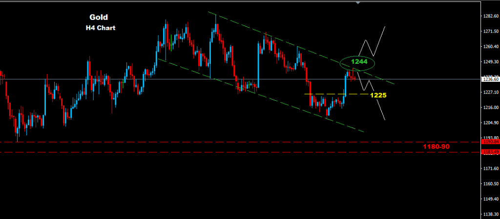 نجح السوق بتجاوز مستويات 1225 يوم امس مما سمح للسوق بمزيد من الارتفاع نحو مستويات 1240 فيما وكما نرى على الرسم البياني فان السوق يواجه منطقة مقاومه للقنال السعريه الهابطه على اسعار 1244