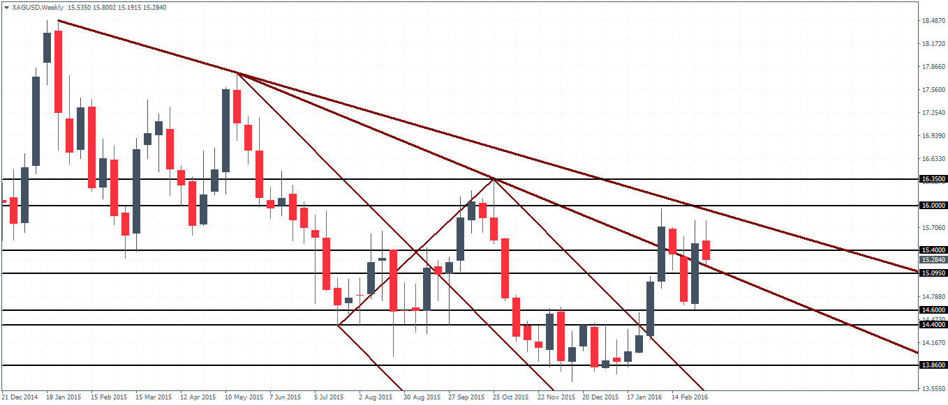 The weekly chart for Silver has seen a strong rebound last week. Prices have in fact closed on a bullish engulfing pattern just above the $14.60 support level. The upside remains biased as long as $15.4 – $15 levels of support remain in play.