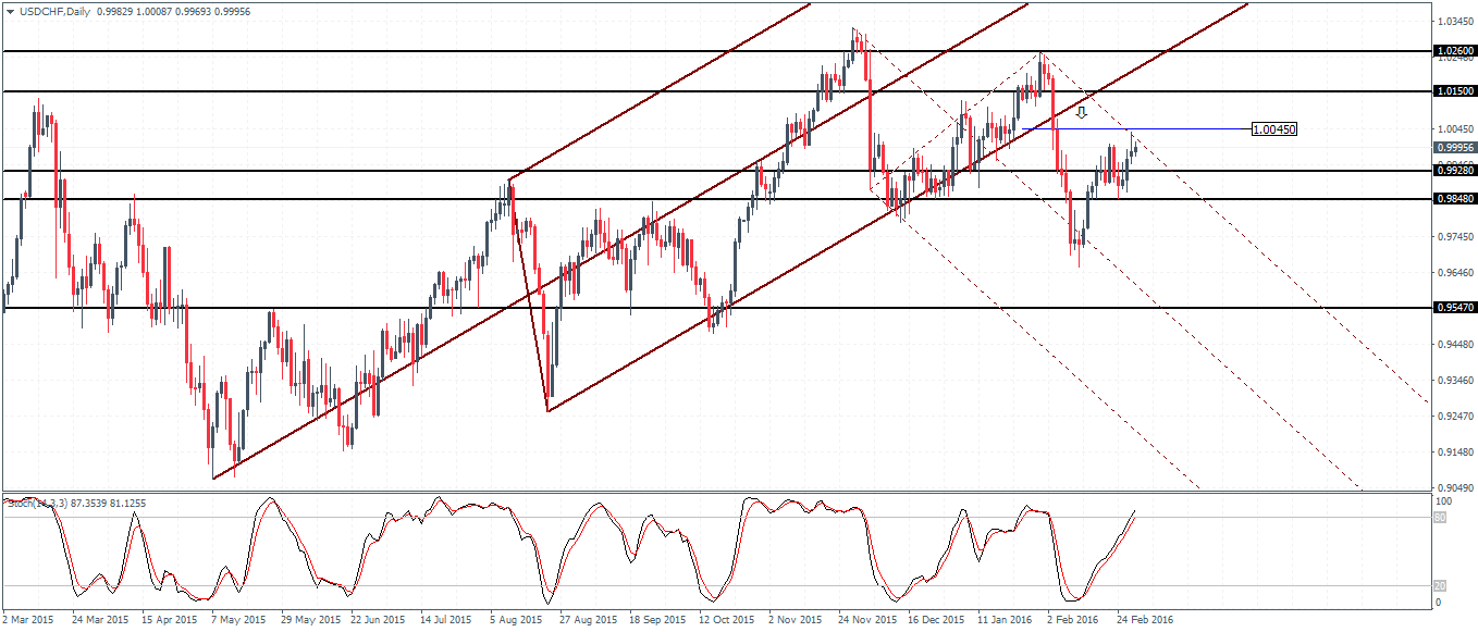 USDCHF (0.99): USDCHF is nearing the identified breakout level from the earlier median line near 1.0045. Prices are trading near the outer median line plotted and a reversal here could see a dip to 0.9928 – 0.9848 support. If this key support breaks, USDCHF could be looking at steeper declines for a test to 0.954. Alternately, a breakout from the outer median line could see a test of resistance near 0.9928 and potentially test the upper resistance near 1.015. The Stochastics oscillator is in the overbought level currently, indicating USDCHF could potentially decline to test the support at 0.9928.