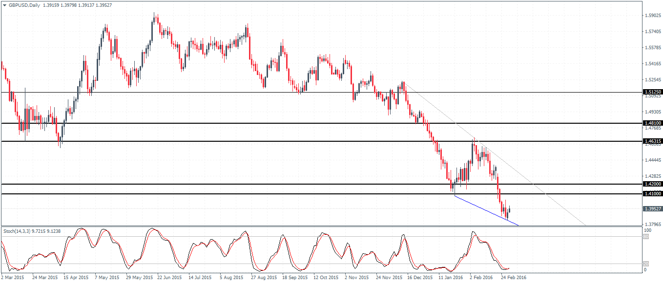 EURUSD (1.086): The single currency has posted a steady decline over the past few days breaking below the 1.11 support. Further declines could see the Euro fall to 1.081 – 1.075 level, where the next support is established. Below 1.075, EURUSD could be looking to test the previous lows established near 1.056 region. However, in the near term, following the break of the trend line, EURUSD could look for a bounce back to retest the broken trend line near 1.095 – 1.10 handle. Establishing resistance on the pullback could pave the way for further downside, to as low as 1.056 levels. The Stochastics on the daily chart is strongly in the oversold level, highlighting the risk of a short-term bounce in prices.
