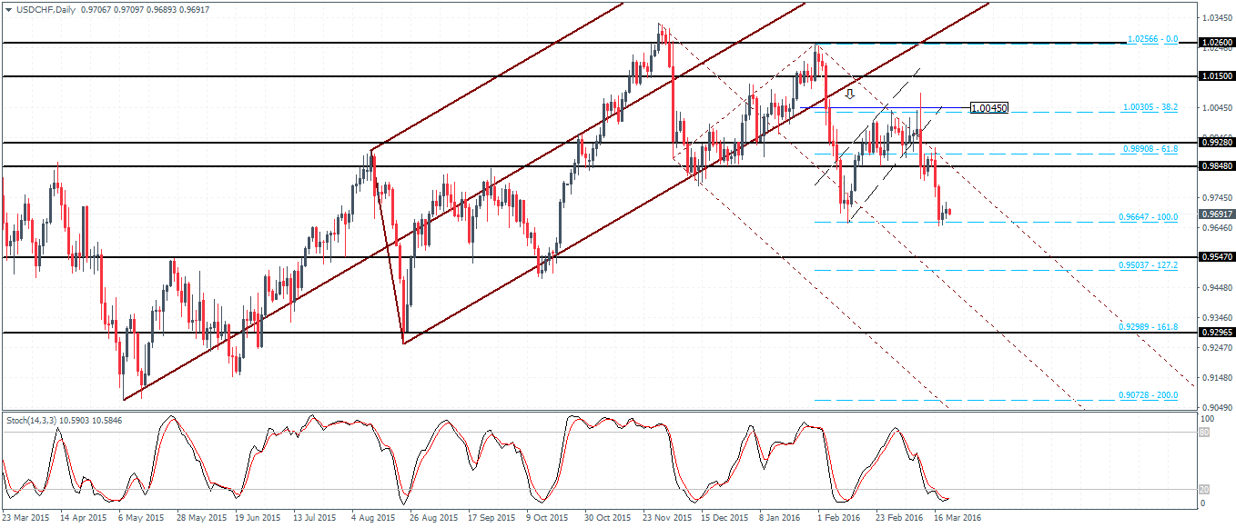 USDCHF (0.9692): USDCHF has established support identified near 0.9665 following the break from the rather steep bearish flag pattern. An upside bounce could see prices retest 0.9848 while a break below the support could see a test to the next main level at 0.954. USDCHF remains biased to the downside but a pullback could be on the cards given the Stochastics remaining in the oversold levels currently.