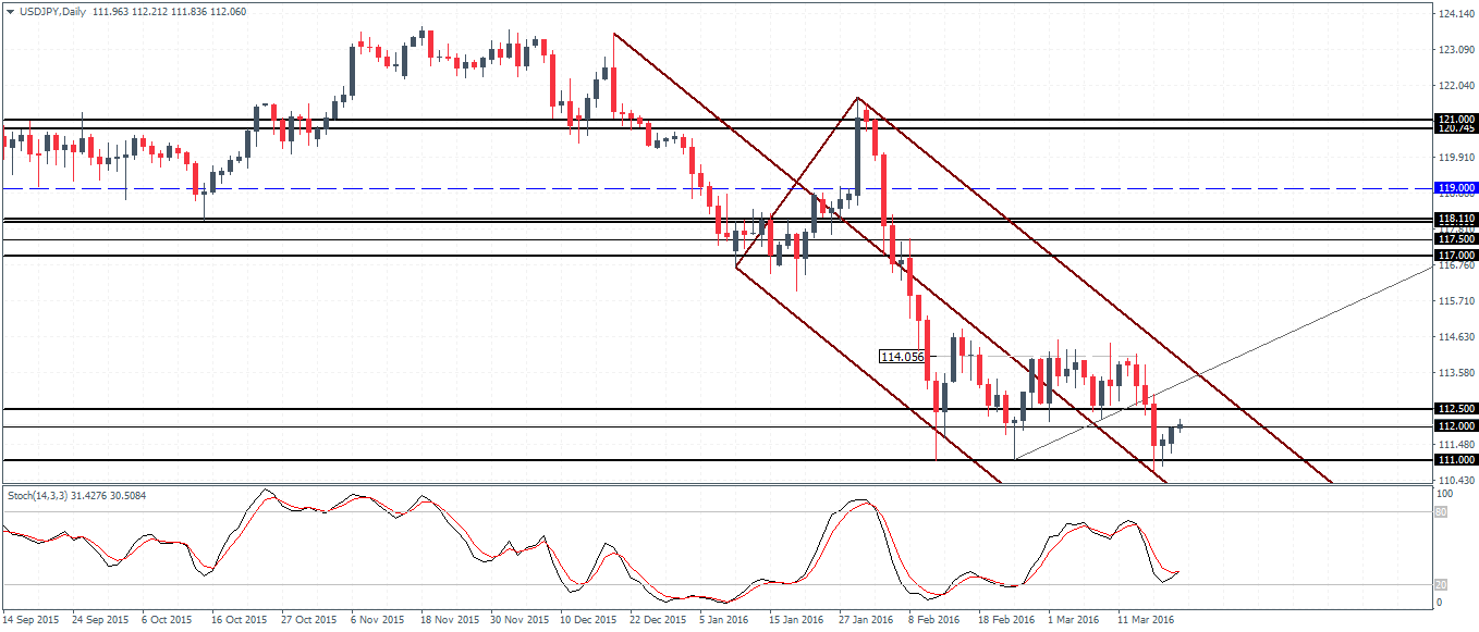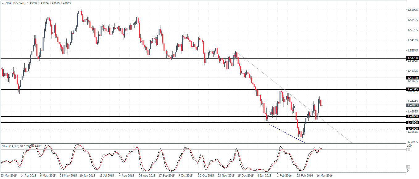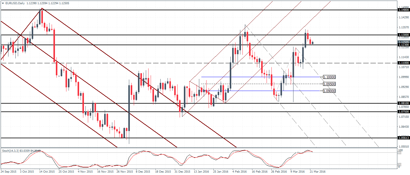 EURUSD (1.125): EURUSD has paused in its rally but the bias remains to the upside for now if prices manage to clear the upper resistance at 1.130 and remains above the previous high at 1.118 – 1.115. To the upside, the next level of interest comes in at the resistance high of 1.148, which was last tested in October 2015. In the event that prices fail to break above 1.130 resistance, the declines could come in the shape of a possible cup and handle pattern as long as EURUSD doesn’t fall below 1.110, in which case above 1.130, prices could rally to as much as 1.160.