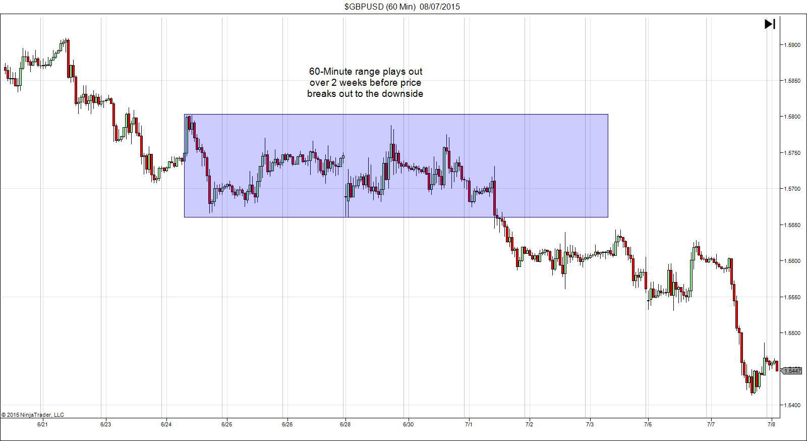 The image below shows the range that forms just under the 2015 range high, as shown on a 60-minute chart.