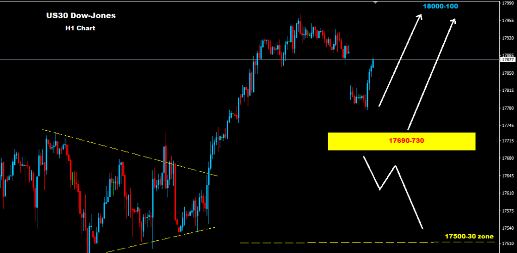 As we see over our previous chart, market managed to hold trades above support 17480 while broke the triangle formation as we see over the chart which managed to fuel the Dow rally so far