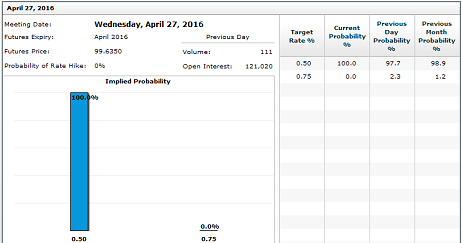 April 2016 CME Fed Fund Futures Watch (100% probability that rates will stay unchanged today)