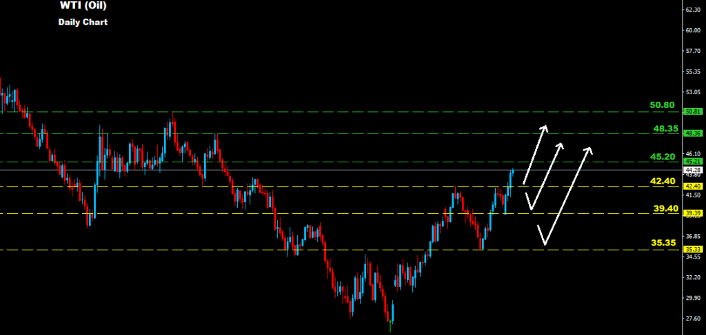 Oil broke above (42.40-43.50) resistance zone which placed Oil on uptrend rally as US Oil output drop.