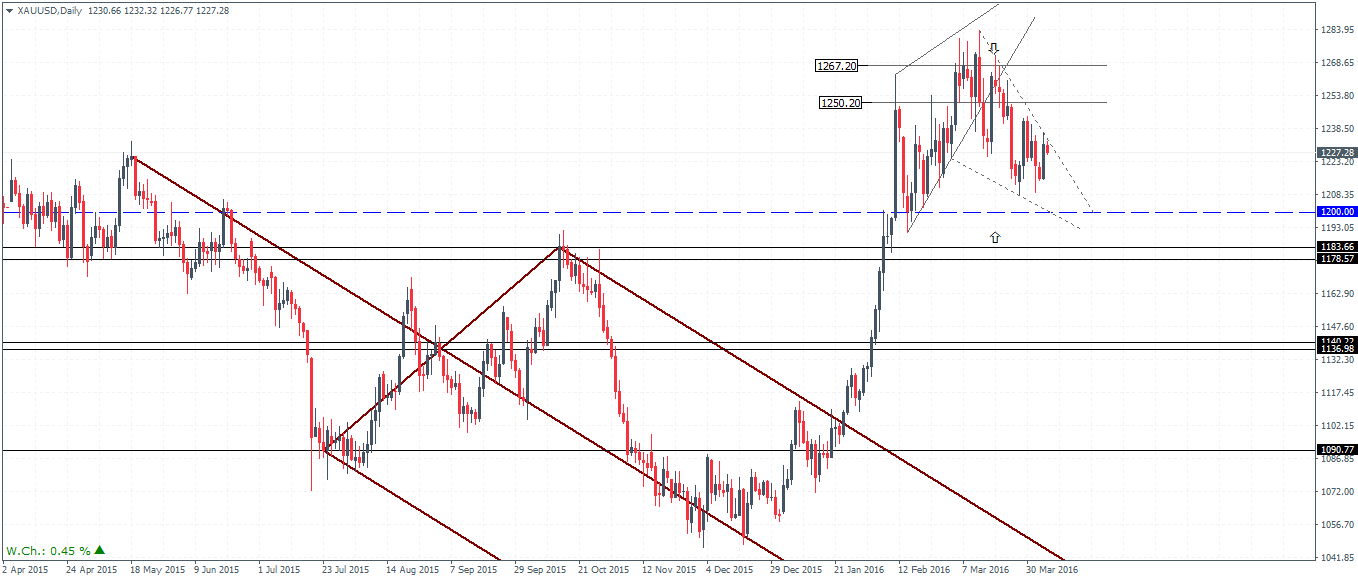 On the daily chart, we notice that prices are consolidating within a newly formed falling wedge pattern. An upside breakout here could see Gold prices move back to the $1250 – $1267 levels, but beyond that further upside looks unlikely. A retest back to this level could keep the correction to $1200 intact.