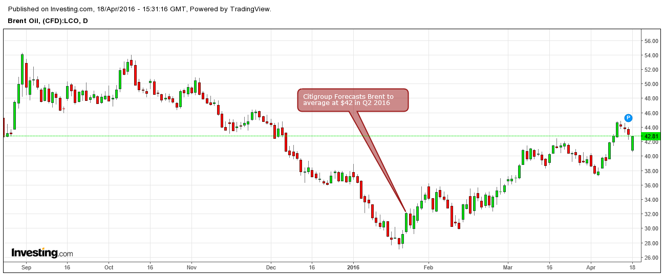 The winner is undoubtedly Citigroup, which called it “trade of the year” back in January 2016. Citigroup’s forecast on oil was supported by UBS Group AG to Societe General SA. According to this article on Bloomberg, Citigroup noted that while Iran’s supply might flood the oil markets even further, they expect production to stay flat. In January, Citigroup said that Oil would hit a bottom within one – three months (Oil hit a bottom near $26 just under a month later) and expects Brent oil to average near $41 in the third quarter of 2016 and to $52 in the final three months.