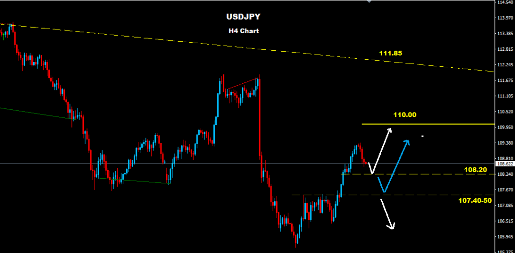 سيواجه الدولار/ين مستويات دعم على اسعار 108.20 و 107.40 حيث وطالما السوق يتداول فوق احد تلك الحواجز فان الترند الصاعد سيستمر باتجاه مستويات 110.00
